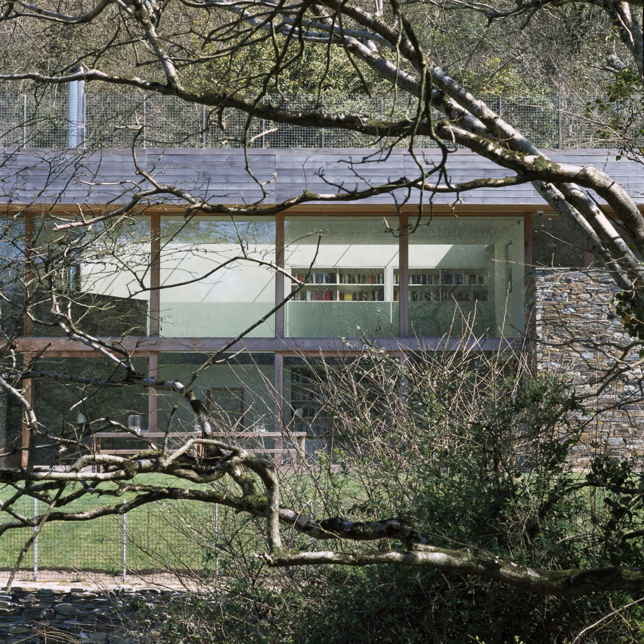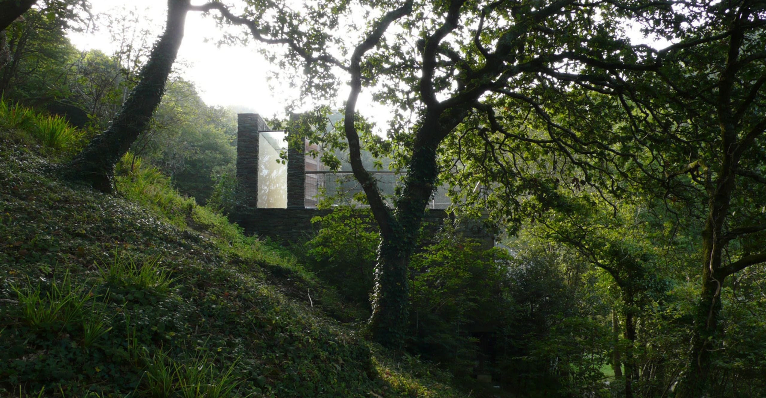 A new build family house located on a steep woodland slope and a small cliff overlooking the Fowey Estuary on the south Cornish coast. The linear plan arcs slightly to follow the land contours while the timber structure is cut into the slope and reinstated by a flat planted roof.