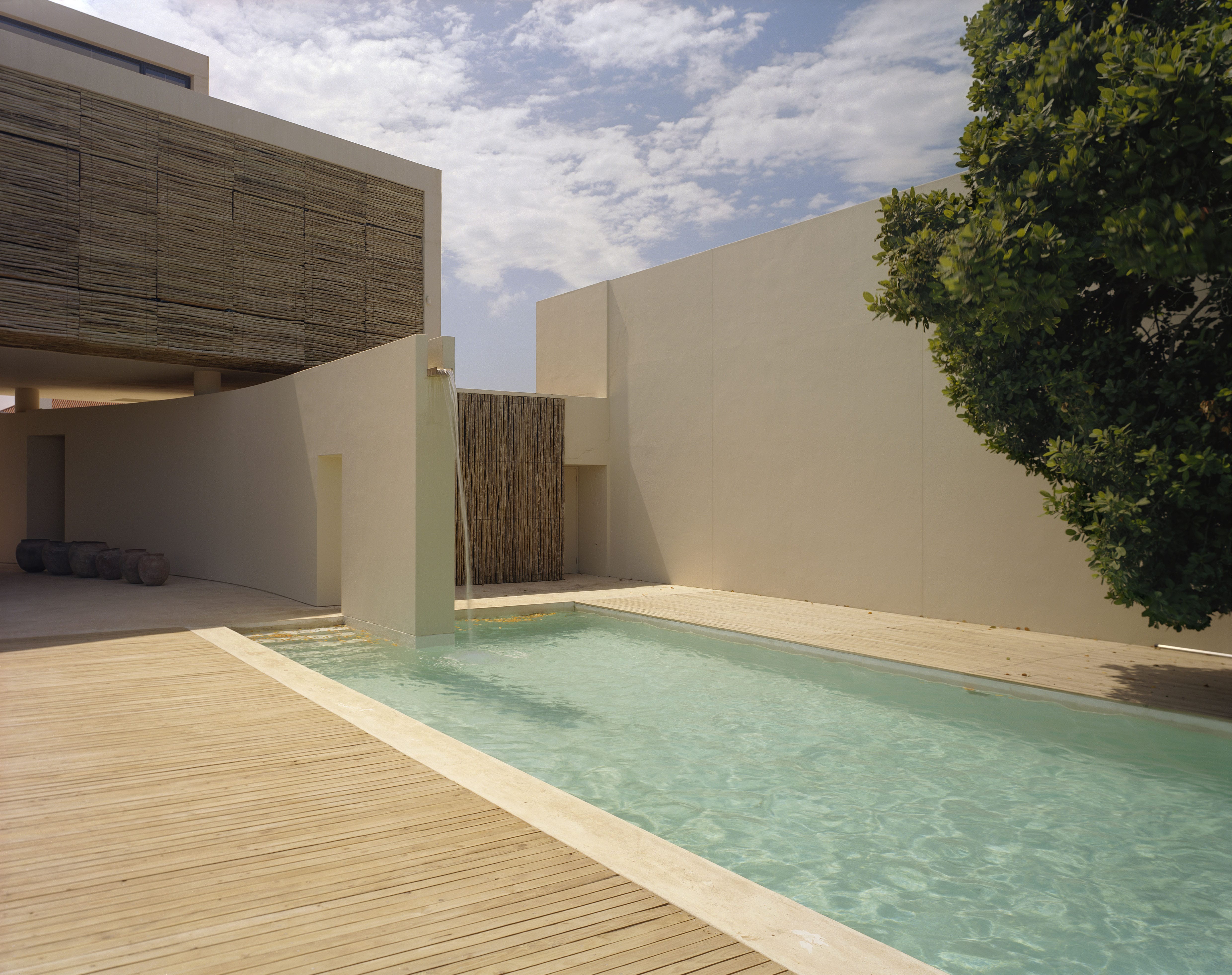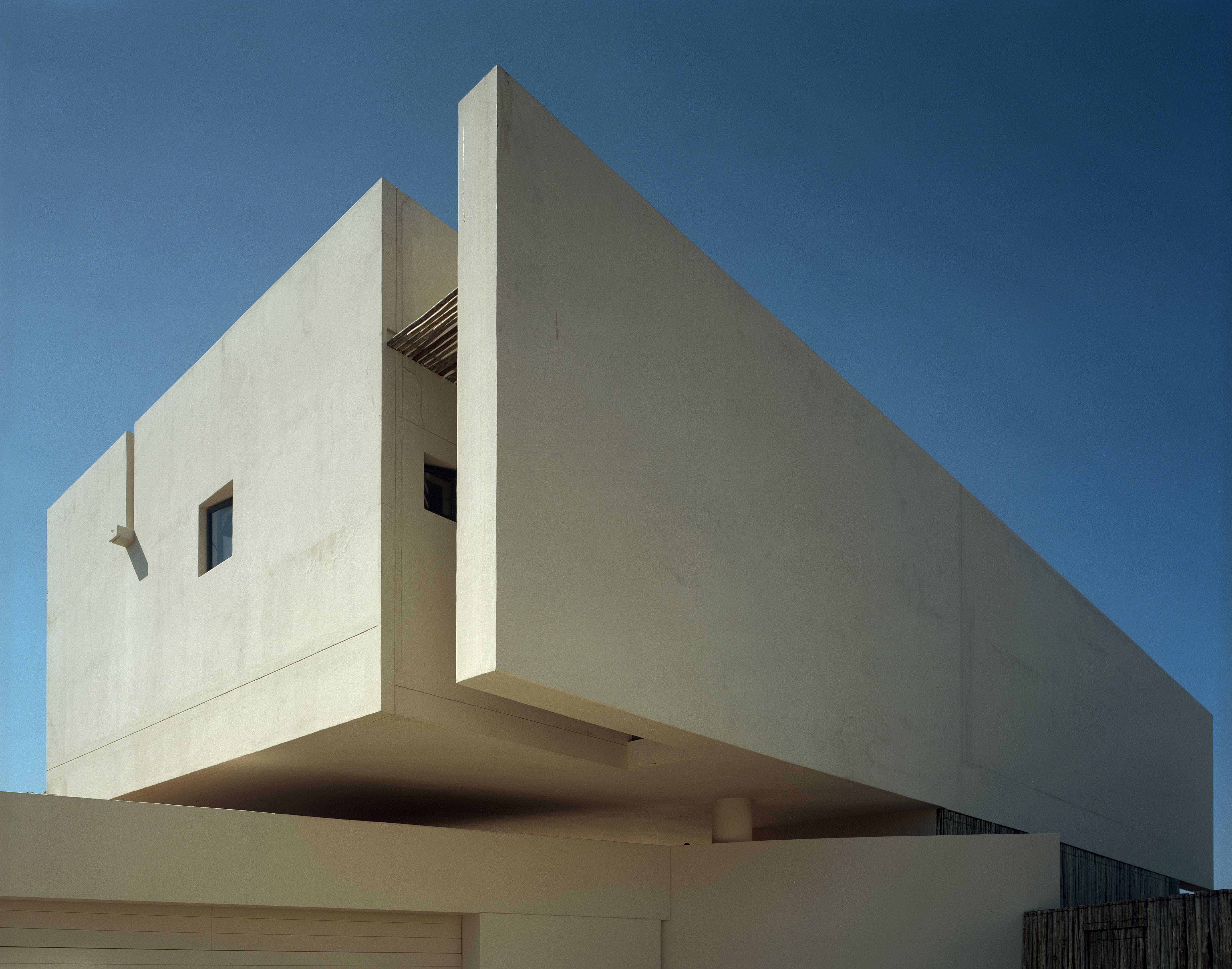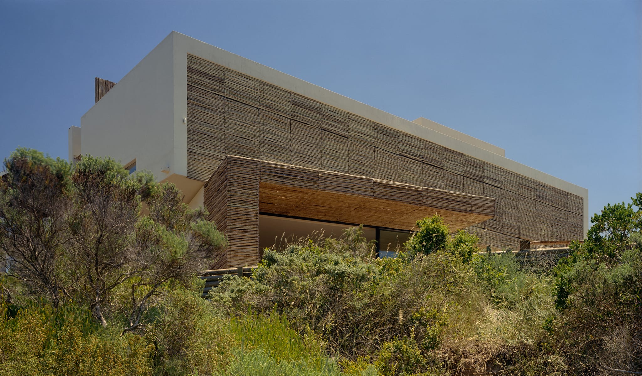 The site is located in Plettenberg Bay on the Western Cape and set amongst the feinbos dunes descending directly to the beach. Bedroom accommodation is provided in a cantilevered box that is open towards the sea and screened by the 23 eucalyptus timber panels operated on counterweights. External areas beneath the box are sheltered and function as outdoor living rooms in addition to the main enclosed space. The bedroom circulation route is delineated by a long eucalyptus screen with roof glazing above, thus filtering natural light into the interior. The curving external wall defines the private territory of the house within the site, and terminates as a water shute into the pool.