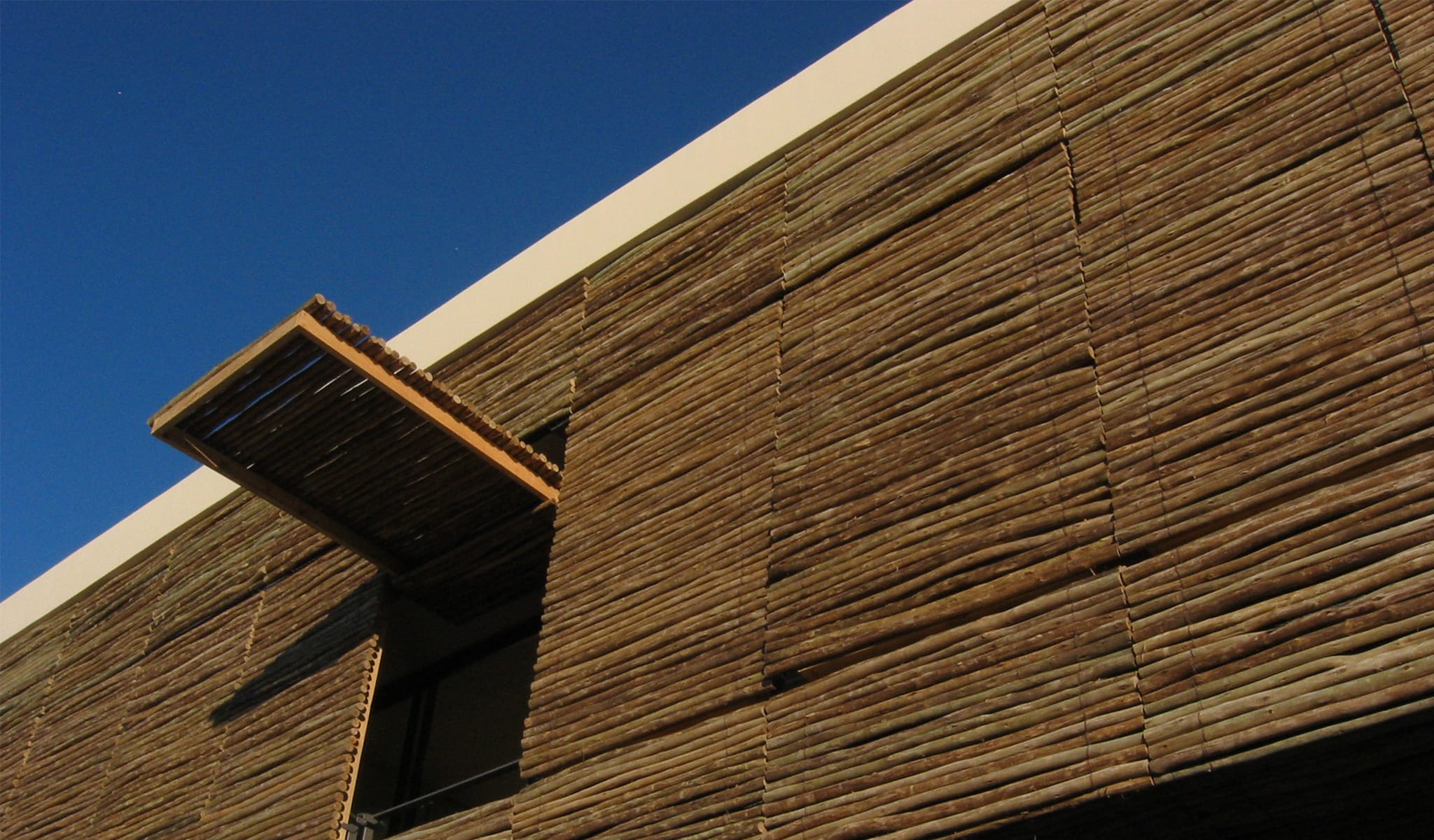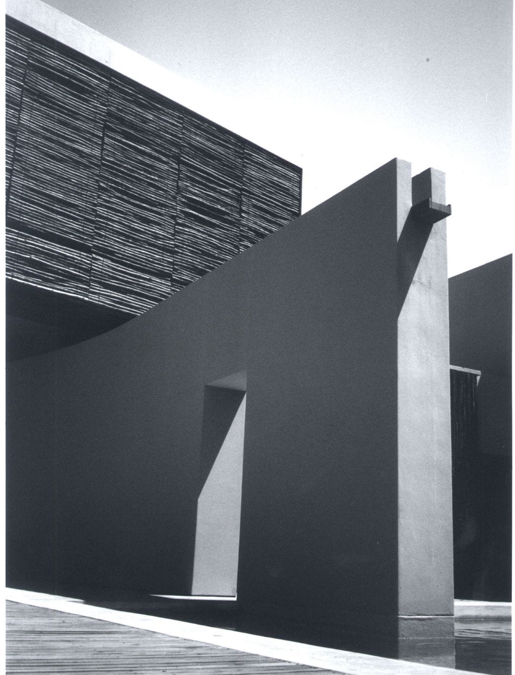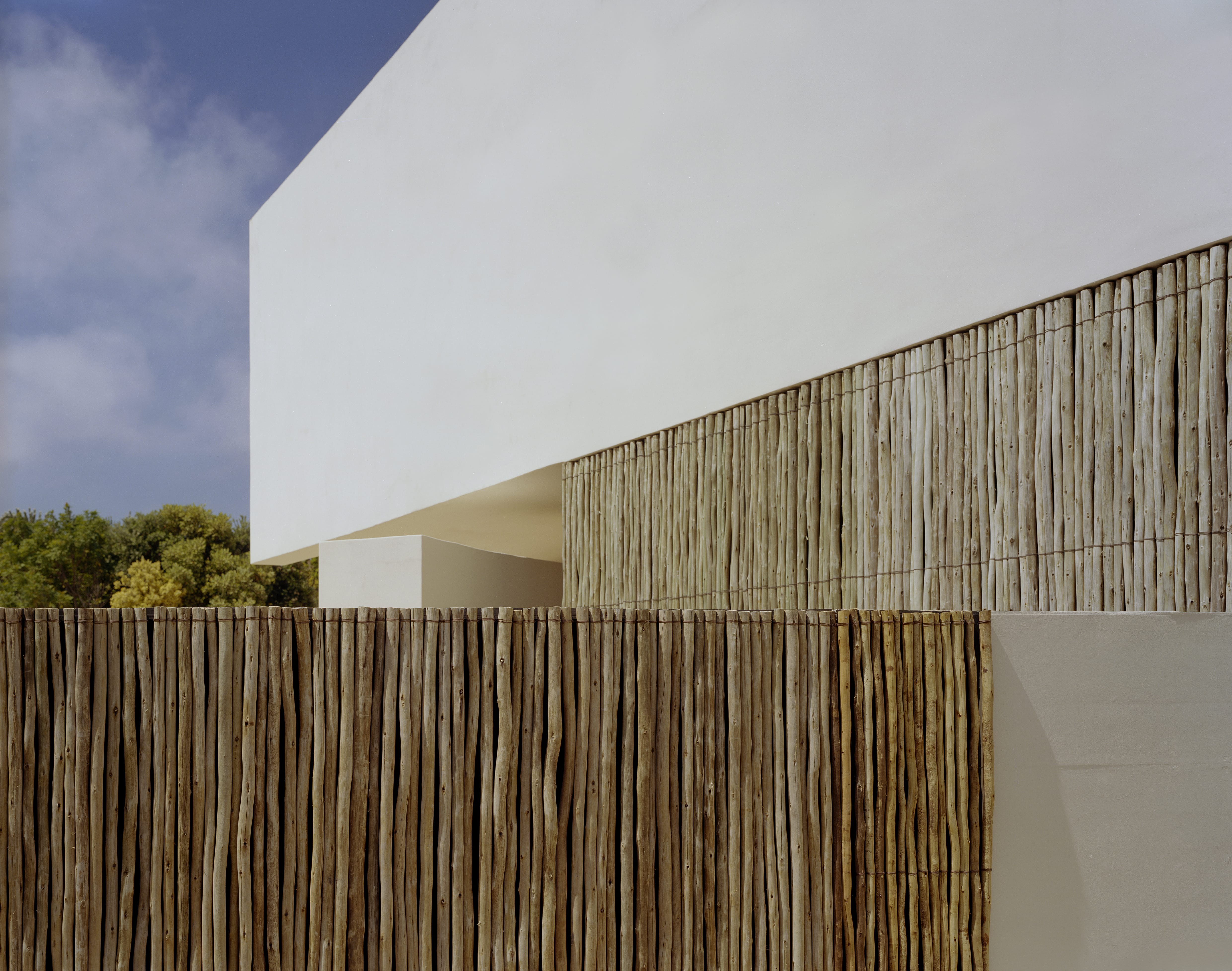 The site is located in Plettenberg Bay on the Western Cape and set amongst the feinbos dunes descending directly to the beach. Bedroom accommodation is provided in a cantilevered box that is open towards the sea and screened by the 23 eucalyptus timber panels operated on counterweights. External areas beneath the box are sheltered and function as outdoor living rooms in addition to the main enclosed space. The bedroom circulation route is delineated by a long eucalyptus screen with roof glazing above, thus filtering natural light into the interior. The curving external wall defines the private territory of the house within the site, and terminates as a water shute into the pool.