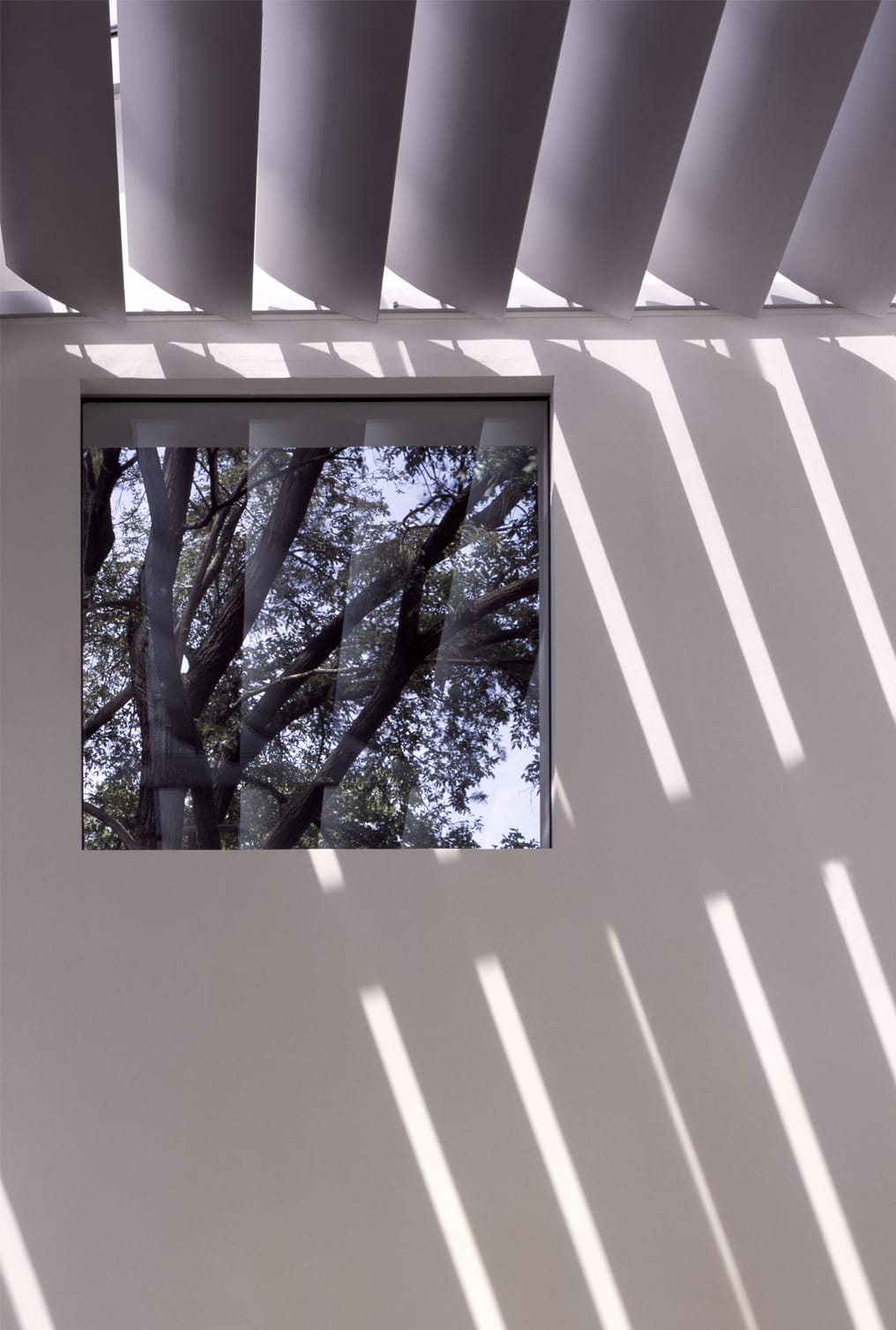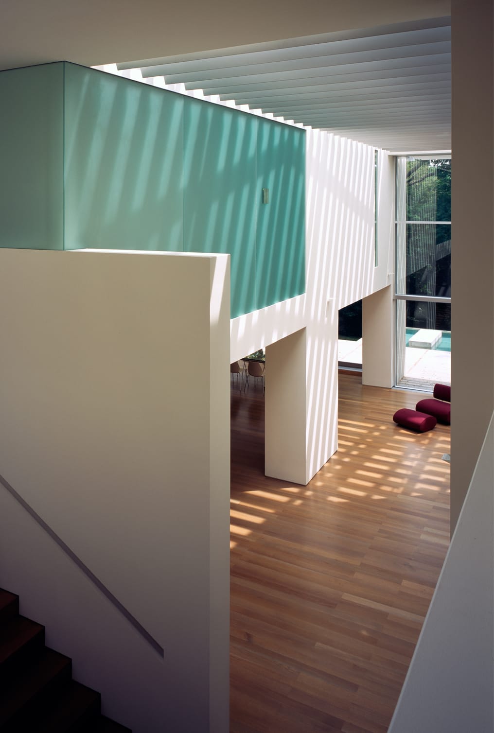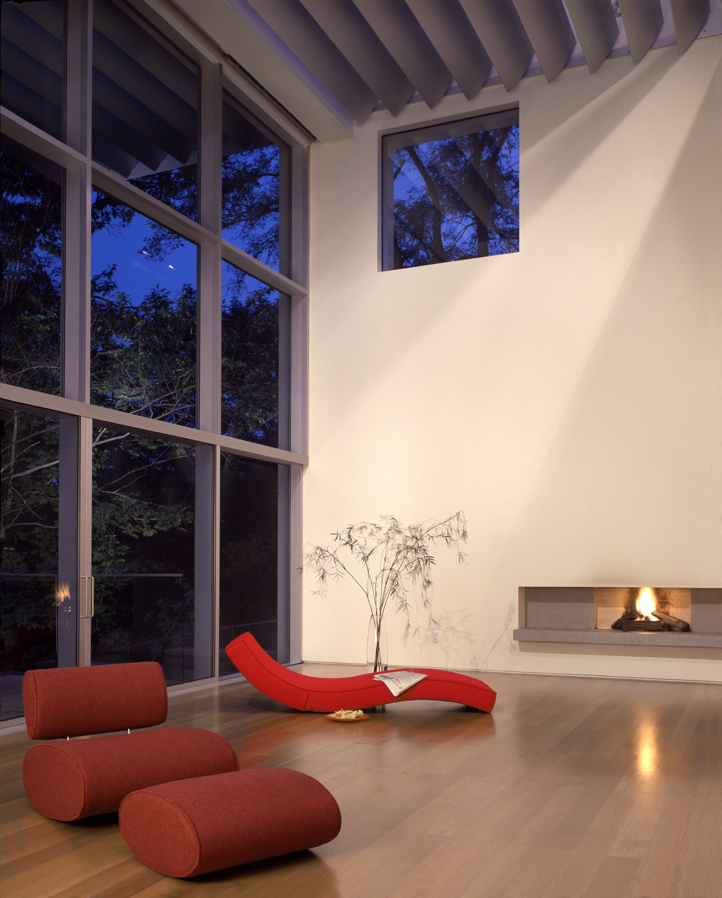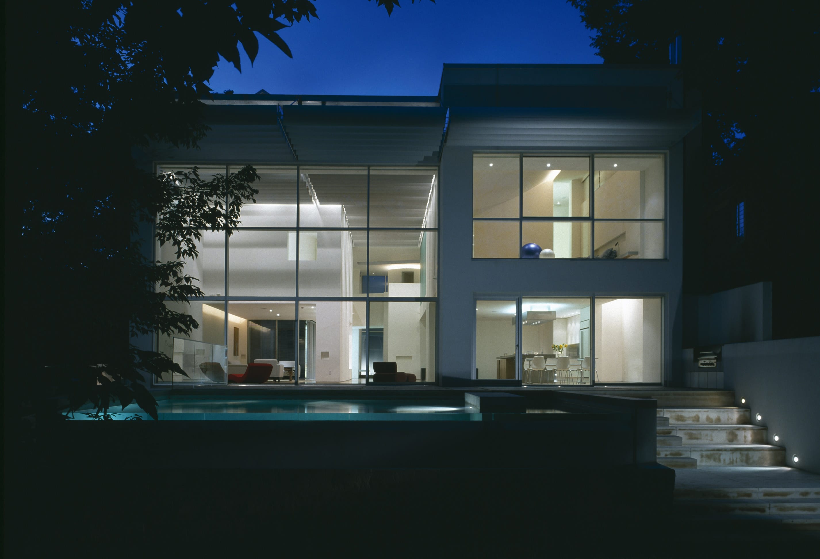 A new build house that reconciles two separate contexts. From the street the setting is suburban whilst to the rear the house opens up to face a forest ravine. The plan is conceived as a cluster of individual houses containing a bedroom for each family member and linked by double-height top glazed communal space and circulation. Adjustable aluminium louvres mounted internally/externally modulate daylight within the living areas.