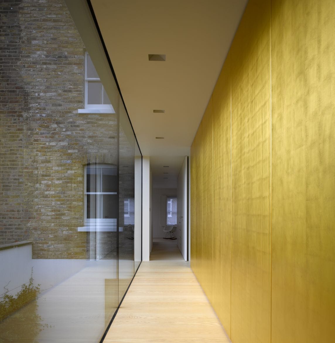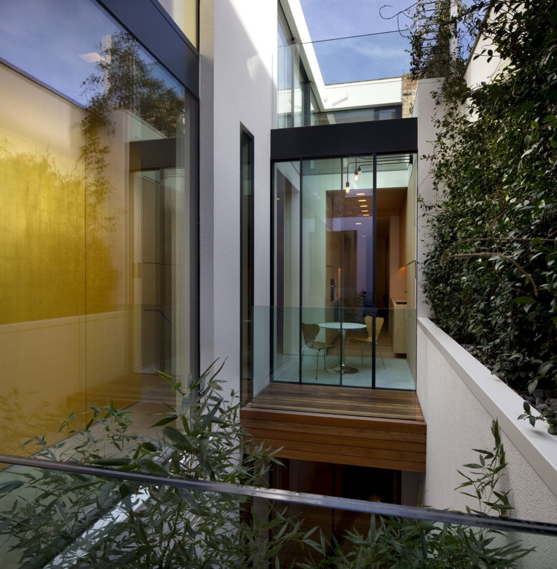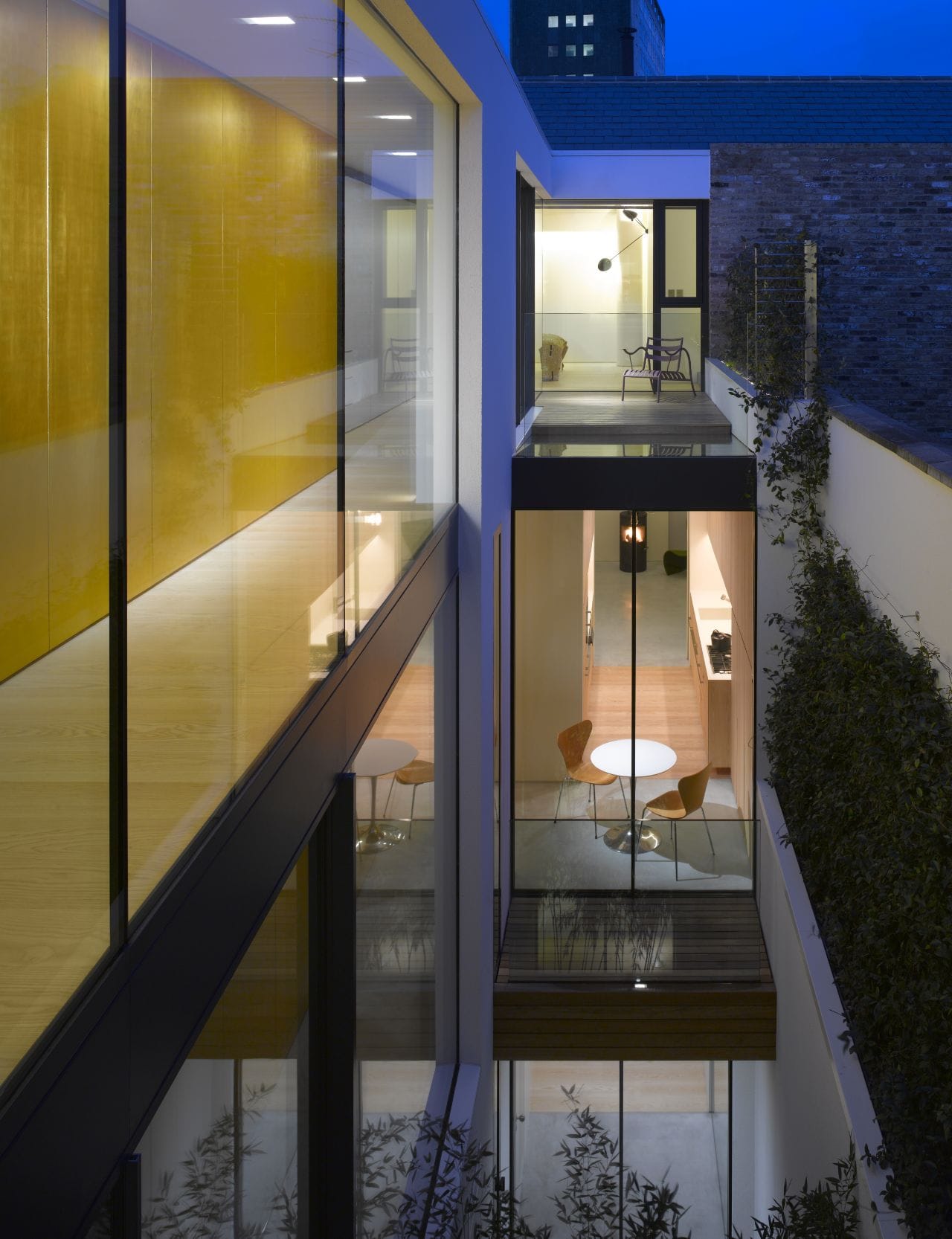 Behind a conventional terraced street elevation the plan extends 26m in depth with accommodation arranged around an internal courtyard and terraces.